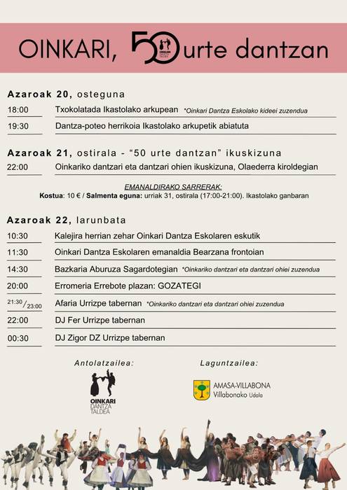 Une gozoa bizitzen ari da Oinkari dantza taldea, 50. urteurrenera iritsi den honetan. 230 dantzari inguru dabil taldean eta 14 irakasle dituzte. Ospakizun betean murgilduta ibiliko dira azaroaren 20tik aurrera, hainbat ekitaldi antolatuta. Gonbidatu ezberdinak ere izango dituzte azaroaren 21eko ekitaldi nagusian.
