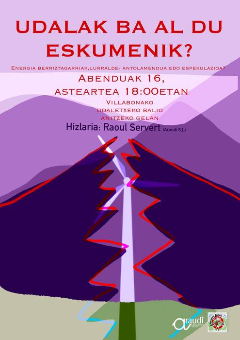 Geologoa eta geomorfologian aditua da Raoul Servet, Araudiko kidea. "Udalak ba al du eskumenik? Energia berriztagarriak, lurralde-antolamendua edo espekulazioa?" izenburupean arituko da Servet datorren asteartean, Amasamendi Bizirik taldeak gonbidatuta.