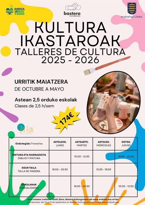 2025-2026 ikasturteko kultur ikastaroetan izena emateko epea irailaren 15ean zabalduko dute. Egur lanketa, pintura eta eskulanak izango dira aukeran.