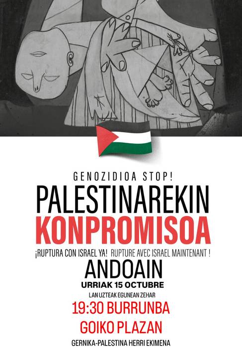Gernika-Palestina herri ekimenak deituta, bihar iluntzean elkarretaratze zaratatsua egingo dute Goikoplazan. 19:30ean hasiko da bilkura. Egun osoan, sindikatuek deituta, lan uzteak izango dira biharkoan.