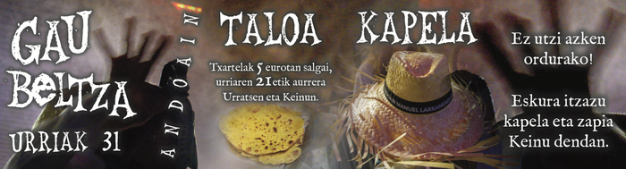 Azken urteotan egin bezala, Gau Beltzako partaideek talo afaria egiteko aukera izango dute urriaren 31n, Etxeberrieta plazan. Txartelak salgai jarriko dira Urratsen eta Keinun, 5 eurotan.