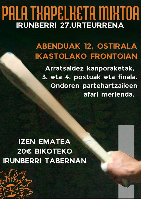 "Badator Irunberriko pala txapelketa mixtoa ! Abenduaren 12an jokatuko da txapelketa osoa, gorde data! Izen ematea, tabernan, gaurkoan hasita", aipamen hori eginez egin dute antolatzaileek iragarpena.