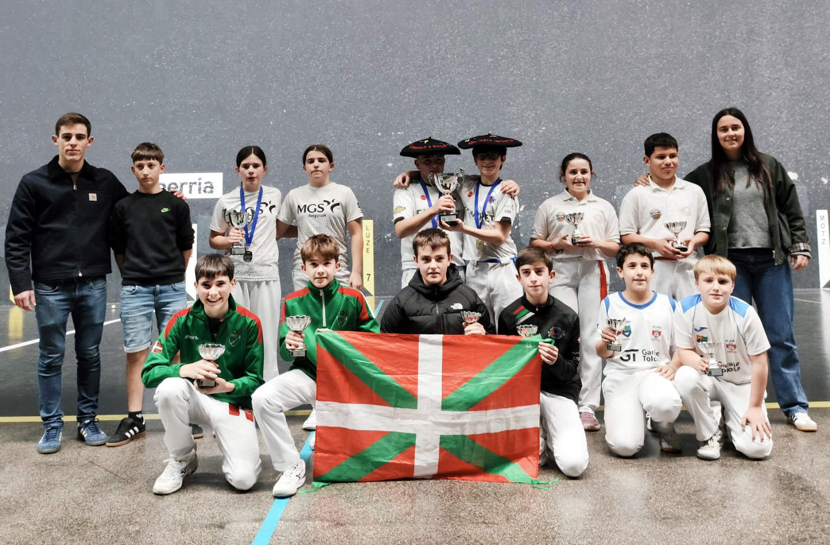 Horrela, Oier Agirrek eta Ander Piñeirok zesta puntan, eskola kiroleko Gipuzkoako txapela jantzi zuten infantil B mailan, Danok Bat elkarteko Paule Zearra-Aitziber Urreisti bikoteari 30-28 irabazi eta gero.