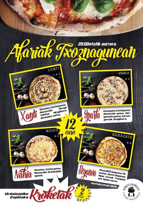 Pizzak eta kroketak jateko aukera izango da apirilaren 30ean eta maiatzaren 1ean eta 2an. 20:00tan otorduak eskaintzen hasiko dira, gauerdira bitarte. Zer esanik ez, bertan afaltzeko mahaiak eta aulkiak izango dira.