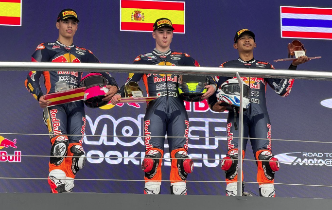 Bujosa 16 urteko gazte espainiarra eta Singhapong tailandiarra izan dira Fernandezekin batera podiumera igo diren kirolariak. Eskarmentua baliatu zuen andoaindarrak eta aurkariaren gurpila ondo zaindu zuen azken bihurgunean bere abiadura-kolpea ezartzeko. Lehen lasterketan, garaipena eta lidertza eskuratu ditu “Pelontxu”k.
