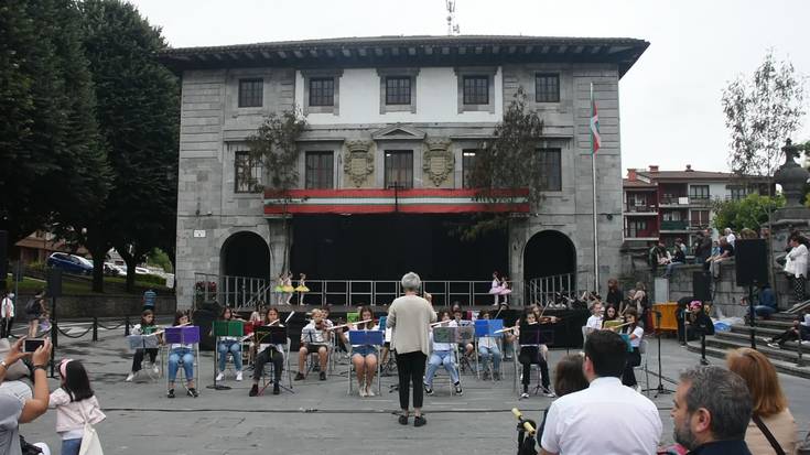 Azelain Balleteko dantzariak eta Udal Musika Eskolako musikariak, saio bat