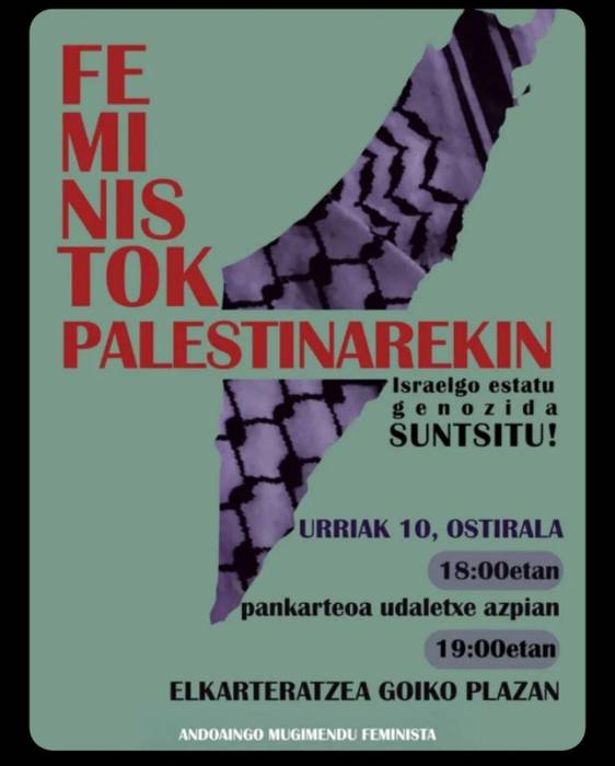 Ez du etenik palestinarren aldeko elkartasun olatuak: mobilizazioak izango dira Euskal Herri osoan, mugimendu feministak deituta, "Feministok Palestinarekin" lemapean. Bailaran, Amasa-Villabonan eta Andoainen egingo dute bilkura bana. Hitzordua urriaren 10ean da, 19:00tan hasita.