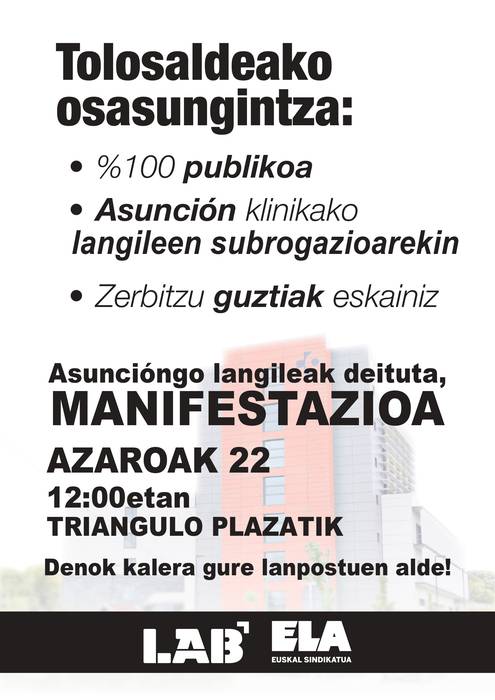 Beste aldarrikapenekin batera, Osasun sailburuari Asuncioneko langileak subrogatzea eskatzen diogu,. Asuncion klinika publifikatzerarekin batera, izan ere eman nahi duten zerbitzuarentzat eraikina egon badago. Edo bestela Tolosan eraikiko den ospitale berrian subrogatuak izango direla bermatzea eskatzen diogu. LABek eta ELAk manifestazio bat deitu dugu datorren azaroaren 22rako, Tolosan, goizeko 12:00etan Triangulo plazatik hasiko dena. Ahalik eta jendetsuena izan dadin, eta inoiz baino ozenago aldarrikatu beharra dugulako, bertara, eskualdeko eragileei atxikitzea eskatzen dizuegu eta bide batez, Tolosaldeako alkateei, langileen subrogazioa bermatzen ez bada, proiektua ontzat EZ ematea eskatzen diegu.