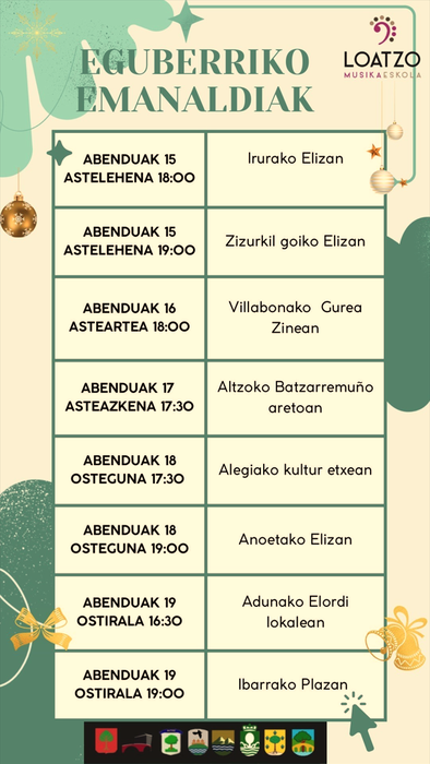 Abenduaren 15ean abiatuta, zortzi emanaldi prestatu dituzte Loatzo Musika Eskolako kideek. Aiztondo bailarari dagokionez, Zizurkilgo herriguneko elizan arituko dira abenduaren 15ean, Villabonako Gurea aretoan abenduaren 16an eta Adunako Elordi aretoan abenduaren 19an.