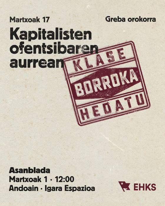 - Langile klasea borrokan heztea da eginkizuna, eta greba egunek horretarako tresna izan behar dute. Martxoaren 17an langileen artean borrokarako grina hedatzeko ekarpena egingo dugu.