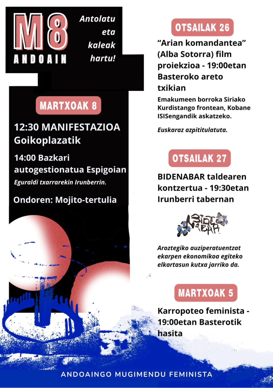 19:30 Bidenabar taldearen kontzertua Irunberri tabernan. Aroztegiko auziperatuentzat ekarpen ekonomikoa egiteko elkartasun kutxa jarriko da.