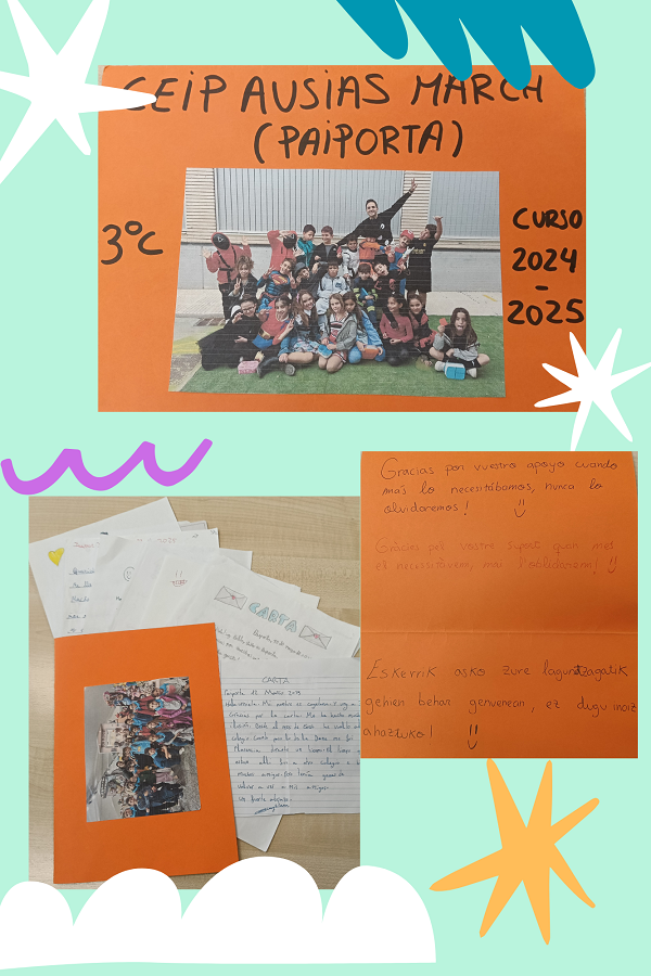 Paiportako ikasleek klaseetara itzultzeko aukera izan zutenean, Udaberriko oporren atarian, LH 3ko ikasleek eskutitzak bidali zizkiguten adierazitako elkartasunagatik eskerrak emanaz. Esker hauek, hiru hizkuntzatan jaso genituen: gaztelaniaz, valentziarrez eta euskaraz. Denori zuzendutako eskerrez gain, ikasle bakoitzak eskutitz bana idatzi zigun. Jasotako ikasleen eskutitz hauek, gure ikastetxeko LHko maila guztietan irakurri zituzten gaztelaniako arloan.