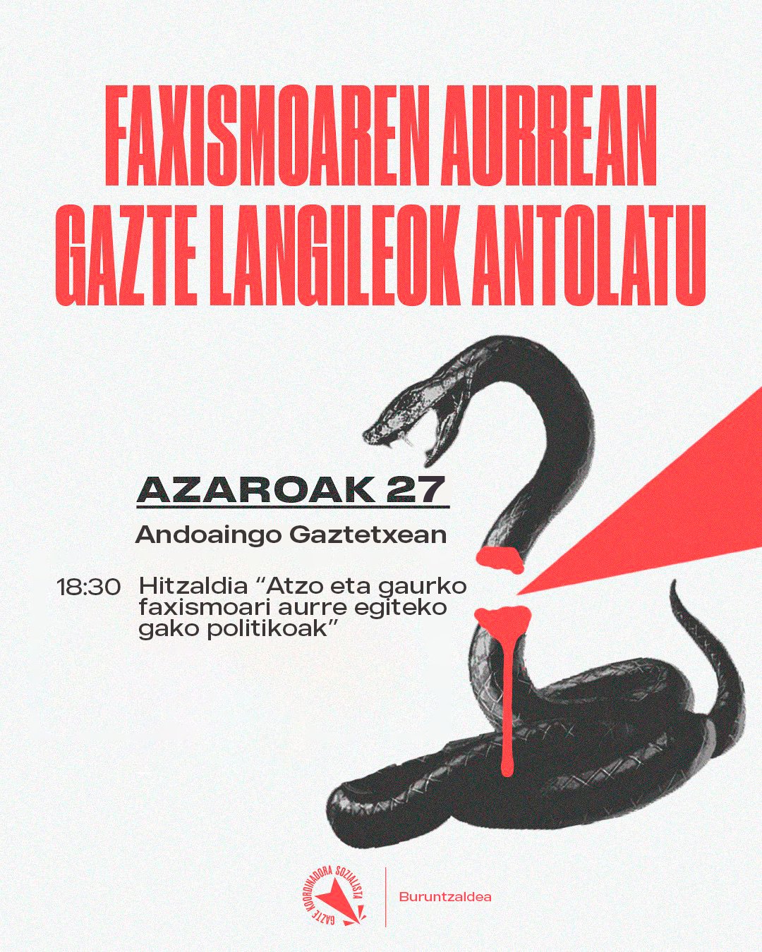 Faxismoaren aurrean gazte langileok antolatu! lelopean, hitzaldia antolatu du Gazte Koordinadora Sozialistak datorren ostegunean, azaroaren 27an. GKSko kideek azaldu dutenez, faxismoaren gorakadaren arrazoiak ulertzeko zenbait gako eskaintzea da hitzaldiaren helburua, faxismoa errotik borrokatzeko.