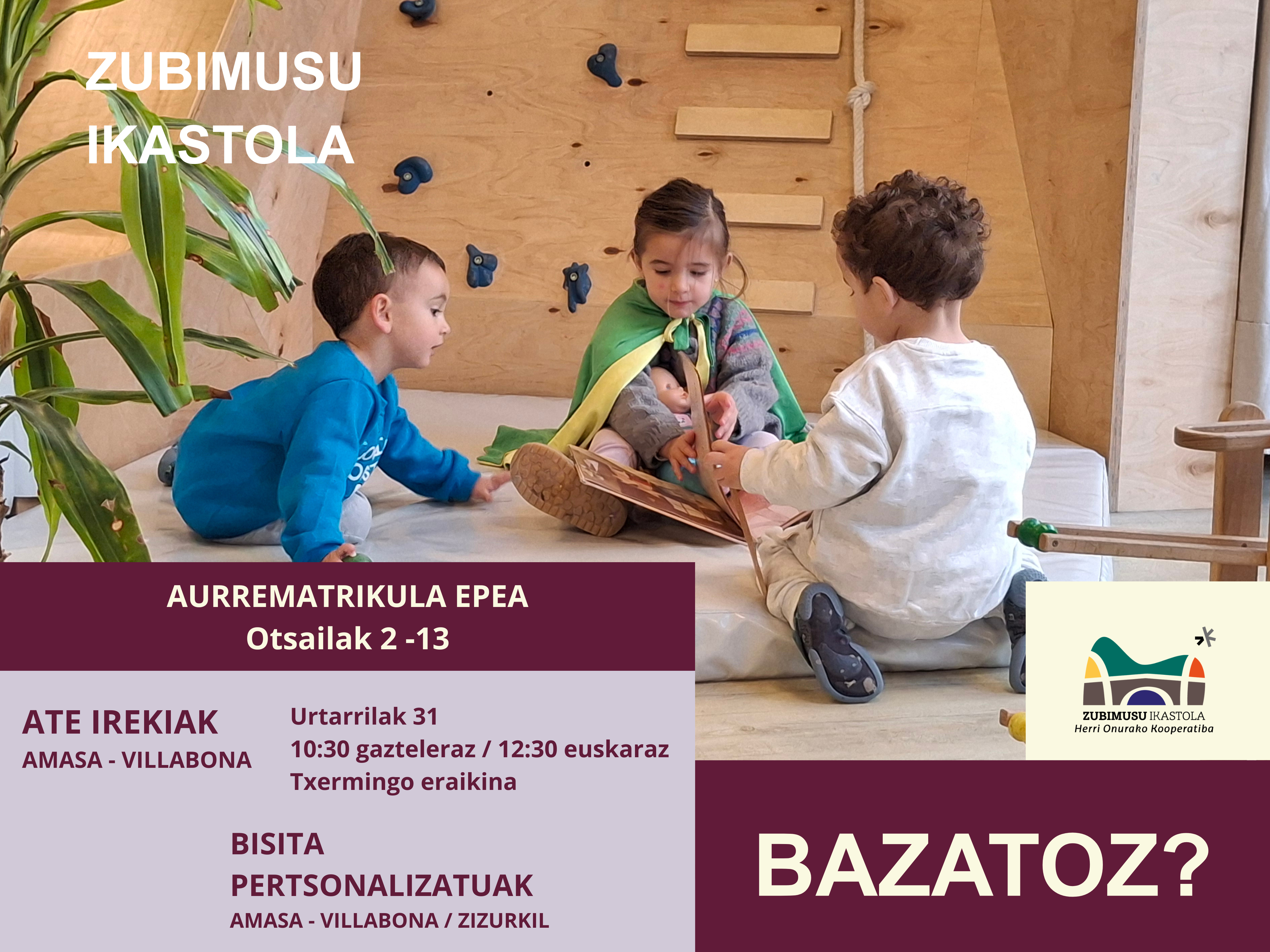 Bisita pertsonalizaturako hitzordua hartzeko, sar zaitez gure webgunean "www.zubimusuikastola.eus" edo deitu 943 692321 telefonora.