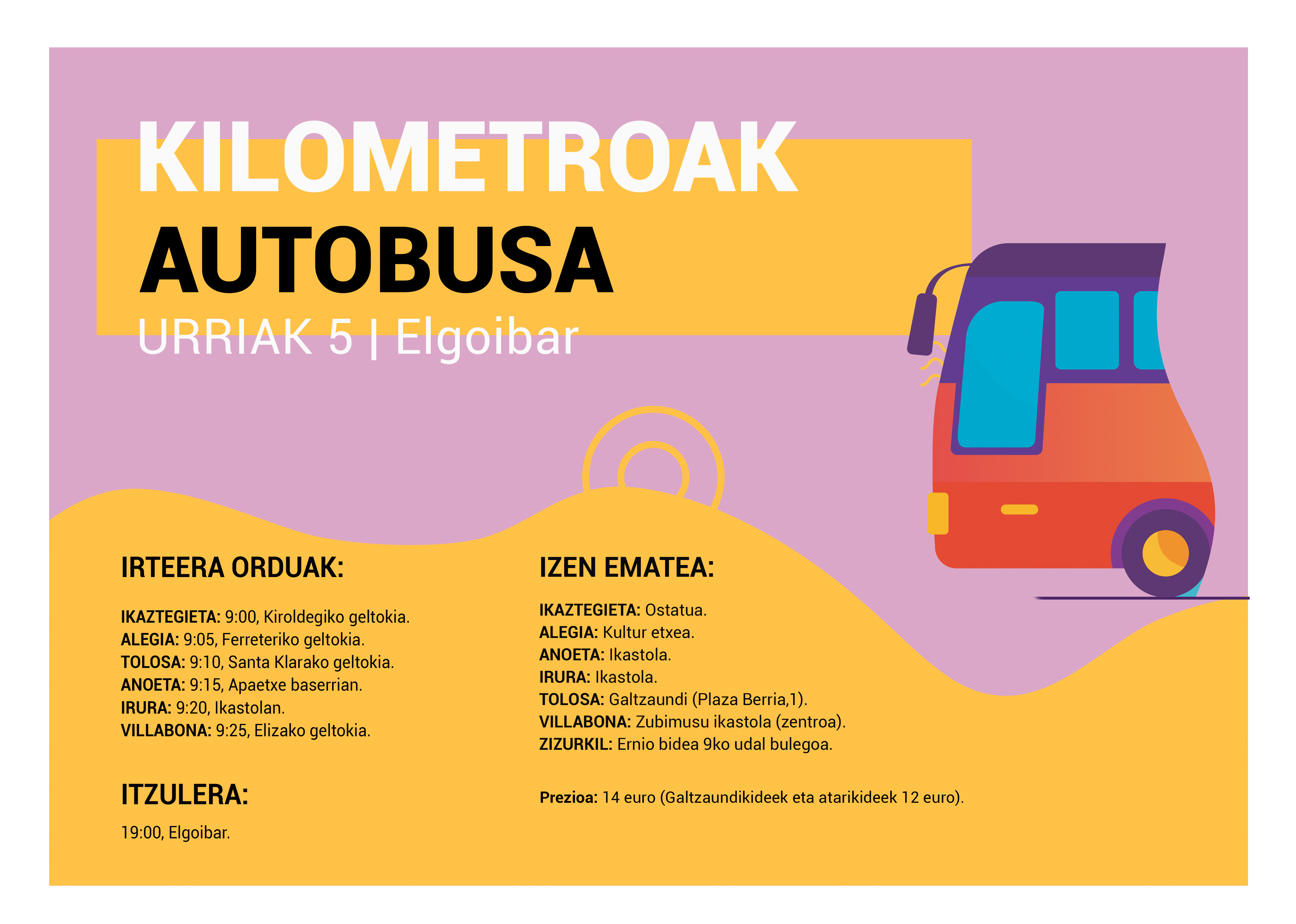 Autobusak 9:00etatik aurrera irtengo dira eta itzulera ordua 19:00etan izango da, Elgoibarren. Hauek dira autobusen irteera puntuak eta ordutegiak herriz herri: