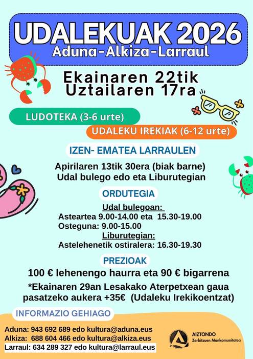 Apirilaren 13tik 30era zabalik egongo da ludotekan (3-6 urte) eta udaleku irekietan (6-12 urte) izena emateko aukera. Udal bulegoetan edota liburutegian egin ahal izango da.