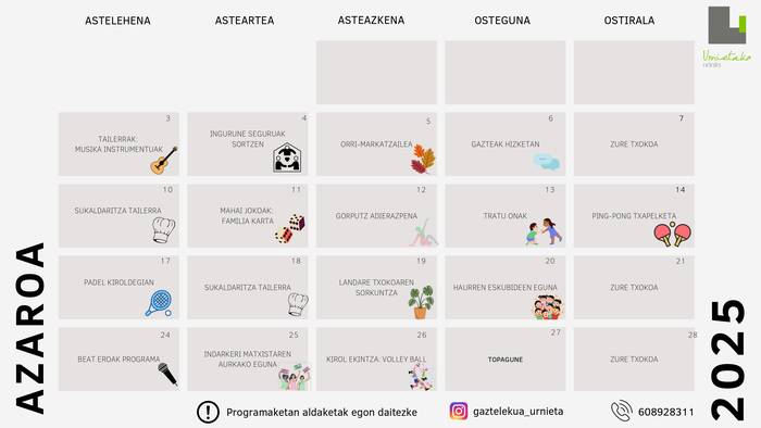 Hitzordu-sorta zabalarekin dator azaroko egitaraua Gaztelekuan: musika tailerra, sukaldaritza tailerra, zure txokoa, gazteak hizketan, mahai jokoak, gorputz adierazpena, ping pong txapelketa, padela, boleibola...