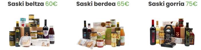- Saski berdea (65 euro): piperrak, olioa, zainzuriak, orburuak, txitxirioak, pasta, tomatea, teilak, txokopipitak, sagar zukua, ozpina eta ardo beltza erdi-ondua.