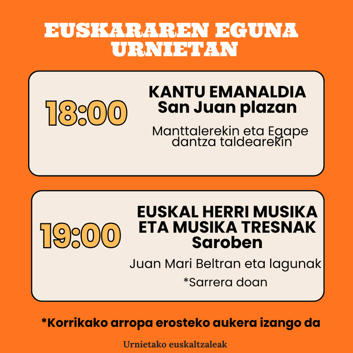 Egitarau berezia antolatu dute herriko euskaltzaleek abenduaren 3an, Euskararen Egunean: arratsaldeko 18:00etan, kantu eta dantza emanaldia izango da Manttalerekin eta Egape Dantza Taldeko kideekin. Ondoren, 19:00etan, Juan Mari Beltran laukotearen bisitaldia jasoko dute urnietarrek Sarobe arte eszenikoen gunean, "Euskal Herri musika eta soinu-tresnak" izenburu duen lanarekin. Bien bitartean, Korrikaren arropa salgai egongo dela jakinarazi du AEK-k.