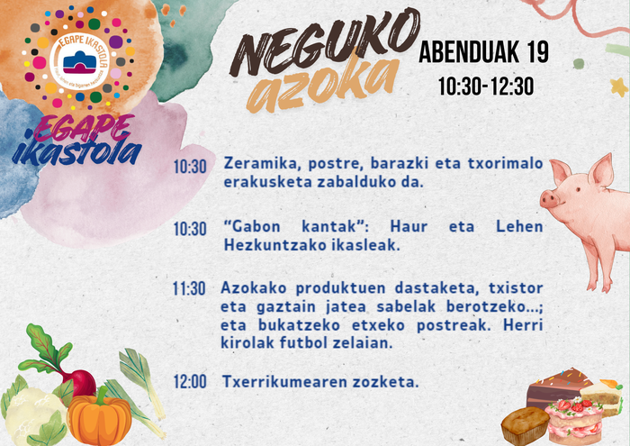 Hasteko, 10:30ean, zeramika, postre, barazki eta txorimalo erakusketa zabalduko da eta, jarraian, Haur eta Lehen Hezkuntzako ikasleek oholtza gainean Gabon kantak abestuko dituzte. Ondoren, 11:30ean, azokako produktuen dastaketa zabalduko da: txistorra, gaztain erreak eta etxeko postreak. Ordu berean, ikastetxeko futbol-zelain, herri kirolak egingo dituzte HH eta LHko ikasleek. Amaitzeko, 12:00etan, txerrikumearen zozketa egingo da eta azokari amaiera emango zaio.