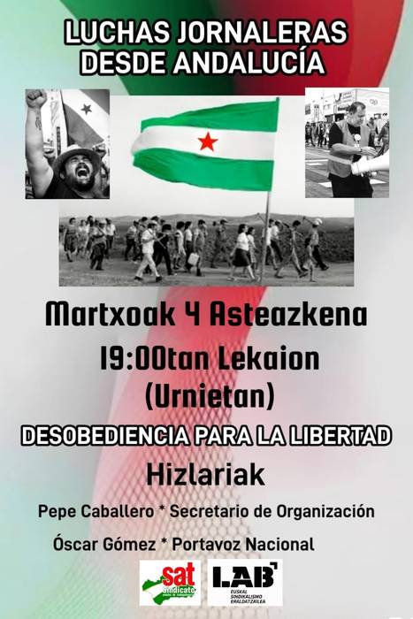 SAT sindikatu ezaguneko bi kide hizlari arituko dira asteazkenean, Lekaion: Pepe Caballero idazkaria eta Oscar Gomez bozeramailea.