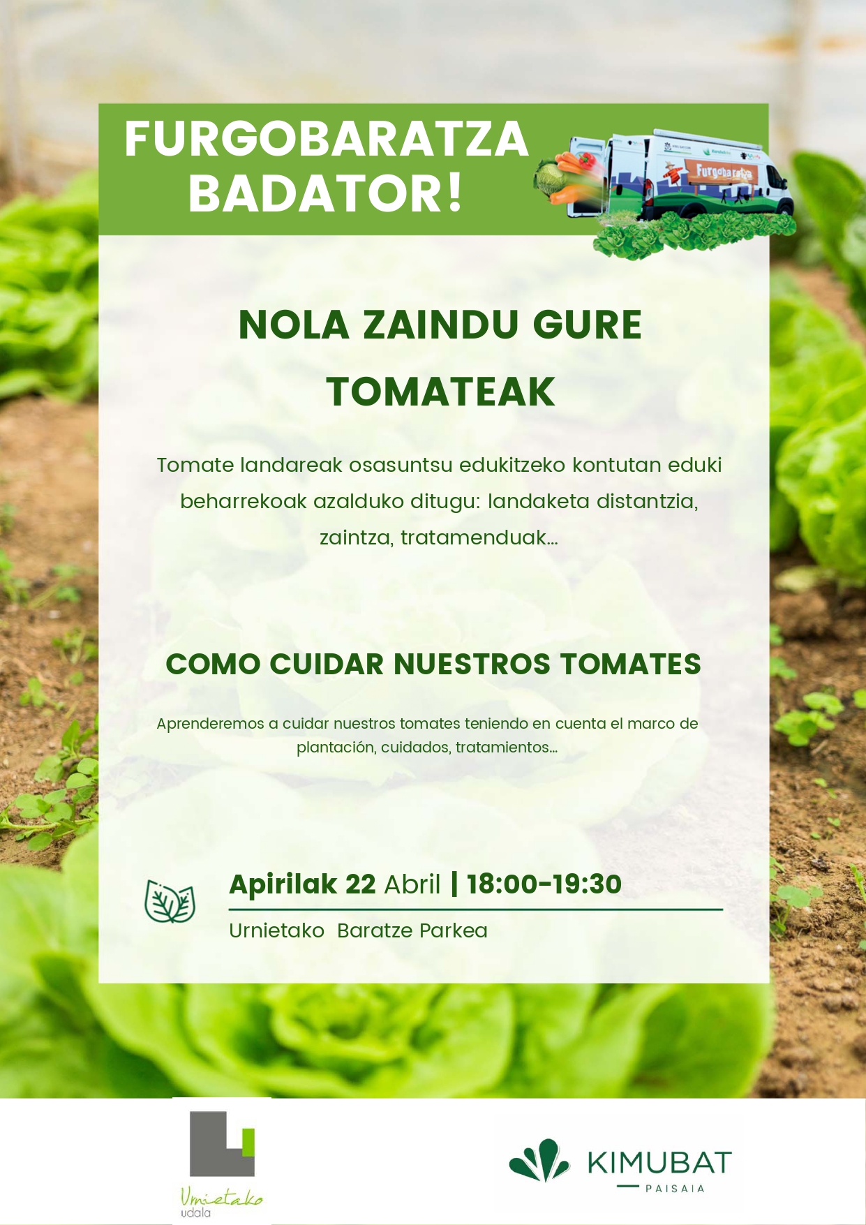 Furgobaratza Urnietako Baratze Parkean egongo da baratza lantzen dutenei tomateen zaintzari buruzko prestakuntza eskaintzeko. Saioan, tomate landareak osasuntsu mantentzeko jarraibideak emango dituzte, besteak beste; landaketa distantzia, zaintza eta tratamenduak.