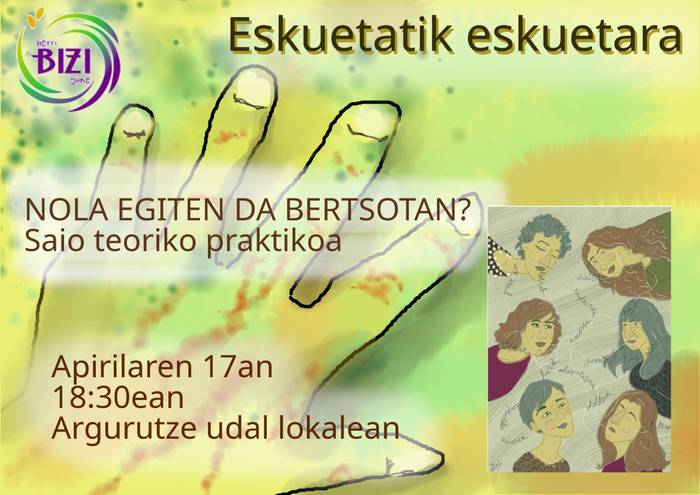 HerriBIZIgunek bertsolaritzaren inguruko saio teoriko-praktikoa antolatu du apirilaren 17rako. Argurutze udal lokalean eskainiko dute saioa, 18:30etan hasita. Bertsotan nola egiten den ikasi ahal izango dute parte-hartzaileek. Izena emateko, 656 743 741 telefono zenbakiarekin jarri behar da harremanetan.
