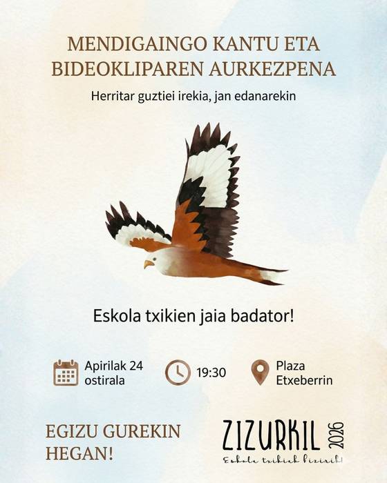 Ostiral honetan, 19:30tan hasita, Mendigaingo kantu eta bideokliparen aurkezpena egingo da Plaza Etxeberrin. Jan-edanak egongo dira eta herritar guztiak gonbidatuta daude ekitaldira. Bide batez, Eskola Txikietako Festako udaberriko material berriaren eskaera egiteko aukera ere eskainiko dute.